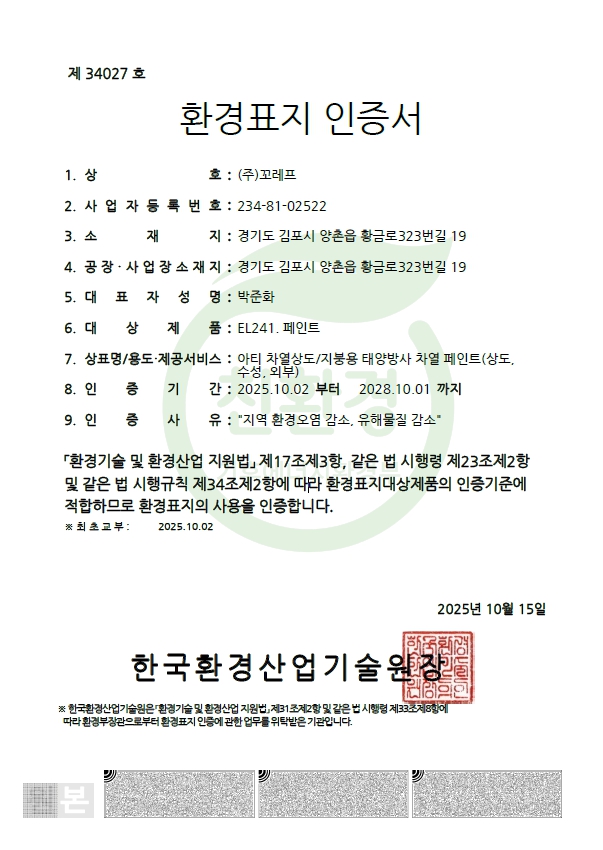| 제34027호 | EL241.페인트 아티 차열상도/지붕용 태양방사 차열 페인트(상도,수성,외부) | 2025-10-02 | 한국환경산업기술원 | 인증서 보기 |