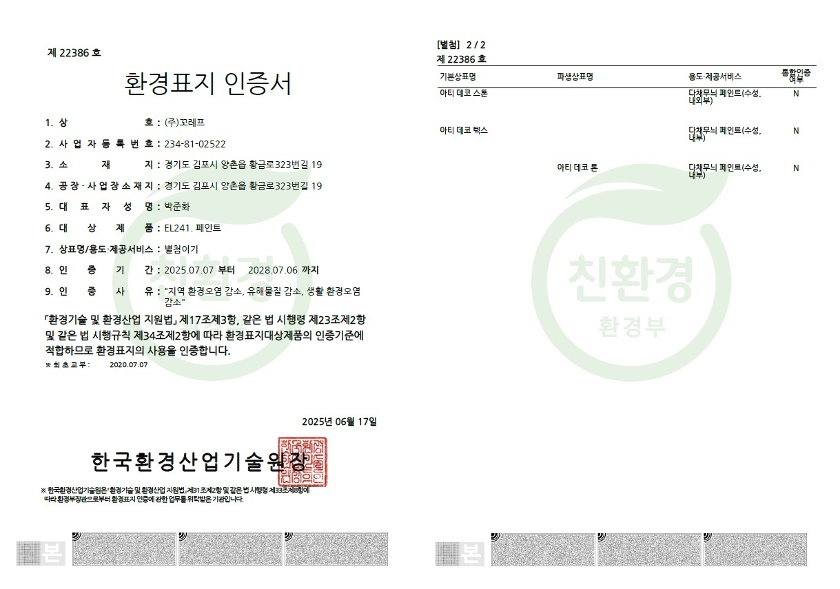 | 제22386호 | EL241.페인트 아티데코스톤/아티데코텍스(다채무늬 페인트) | 2022-05-17 | 한국환경산업기술원 | 인증서 보기 |
