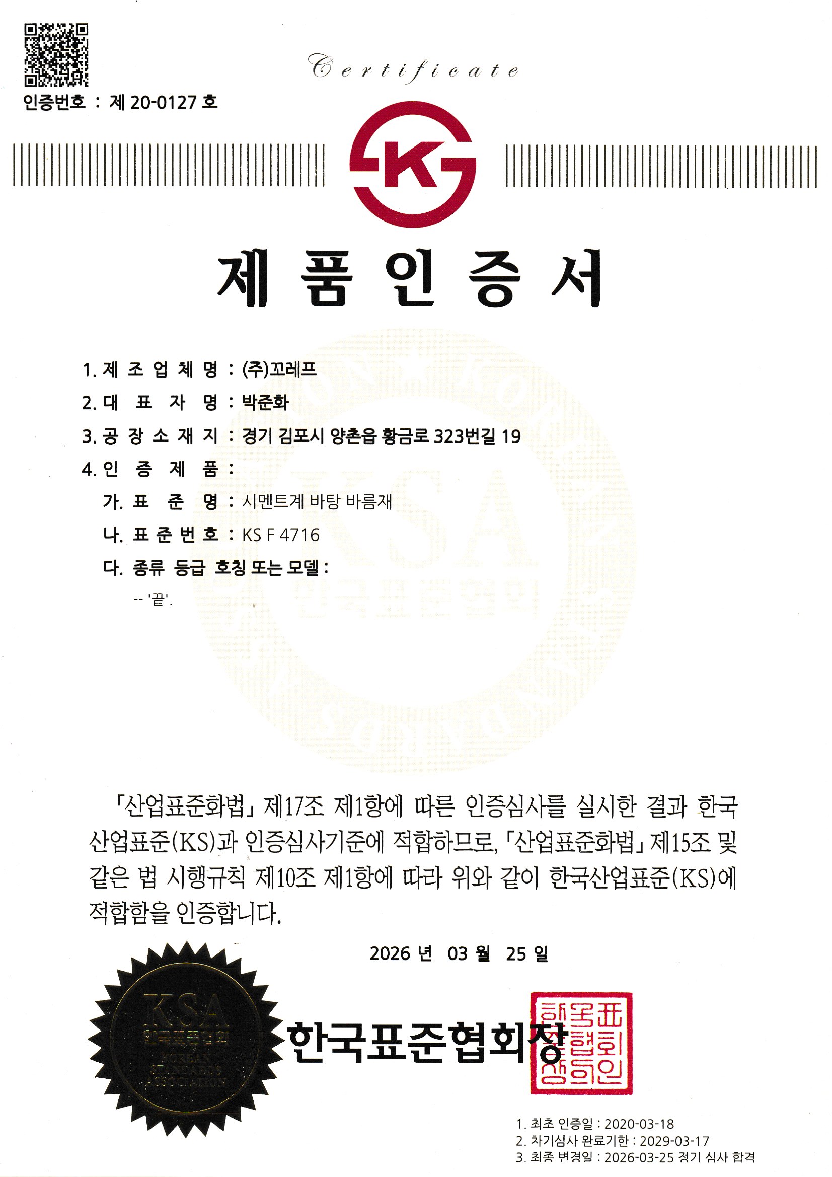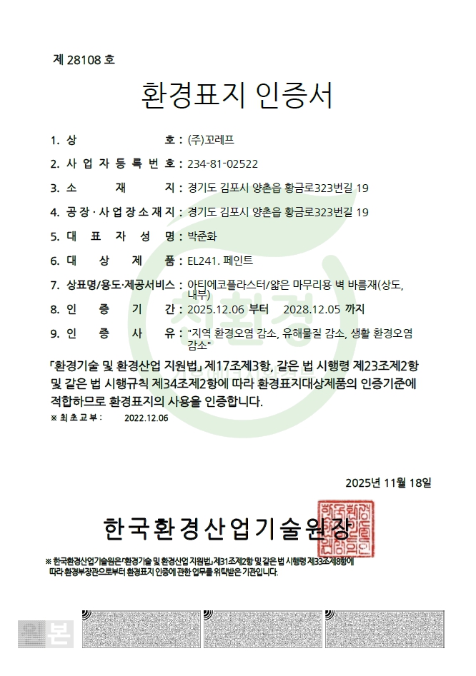 | 제28108호 | EL241.페인트 아티에코플라스터(얇은 마무리용 벽바름재) | 2022-12-06 | 한국환경산업기술원 | 인증서 보기 |