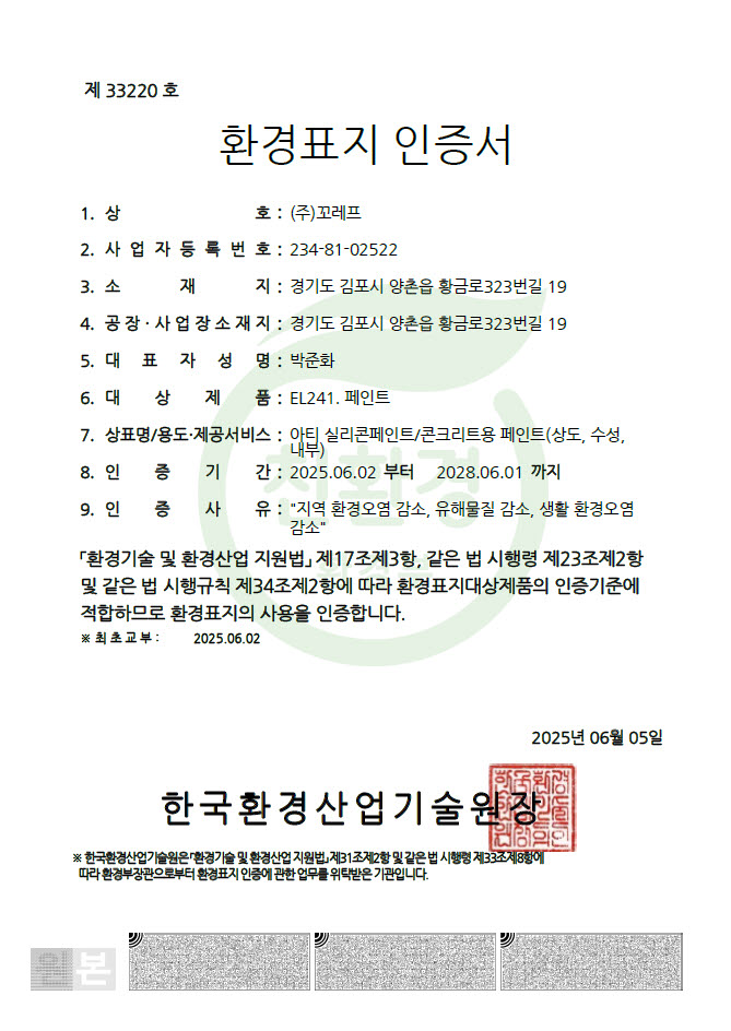 | 제33220호 | EL241.페인트 아티 실리콘페인트(상도,수성,내부) | 2025-06-05 | 한국환경산업기술원 | 인증서 보기 |